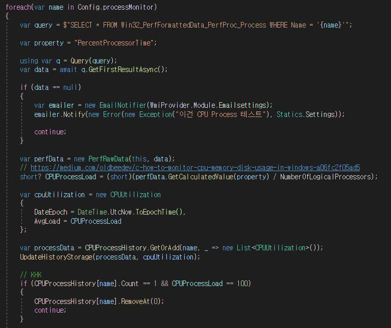 그리고 옛날 버전에도 있던 부분인데 WMI 버그인지 최초1회에는 100%을 치는 부분이 있어 해당 부분은 예외 처리 했습니다 (HW CPU도 마찬가지로 100%을 침)